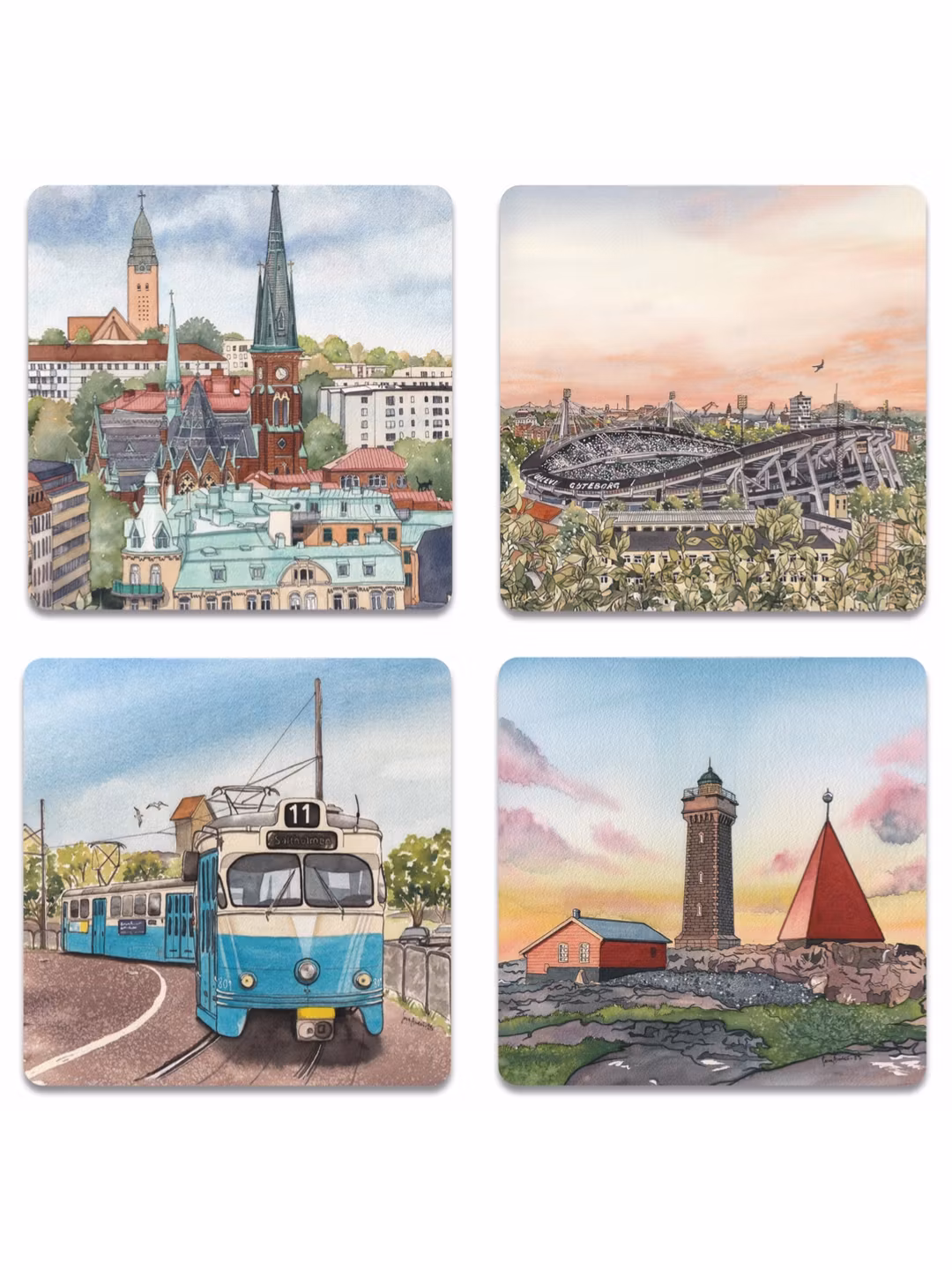 I lager. Glasunderlägg 4-pack Göteborg 299 kr Lägg i korgen Hållbara glasunderlägg av björkfanér. Paketet innehåller fyra st underlägg med motiven Linné, Ullevi, Saltholmen och Vinga. Tillverkas för hand på Öland. Fraktkostnad: 49 kr