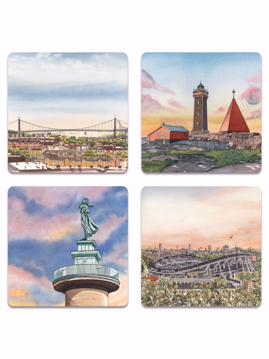 I lager. Glasunderlägg 4-pack Landmärken 299 kr Lägg i korgen Hållbara glasunderlägg av björkfanér. Paketet innehåller fyra st underlägg med motiven Älvsborgsbron, Vinga, Kvinna vid havet och Ullevi. Tillverkas för hand på Öland. Fraktkostnad: 49 kr