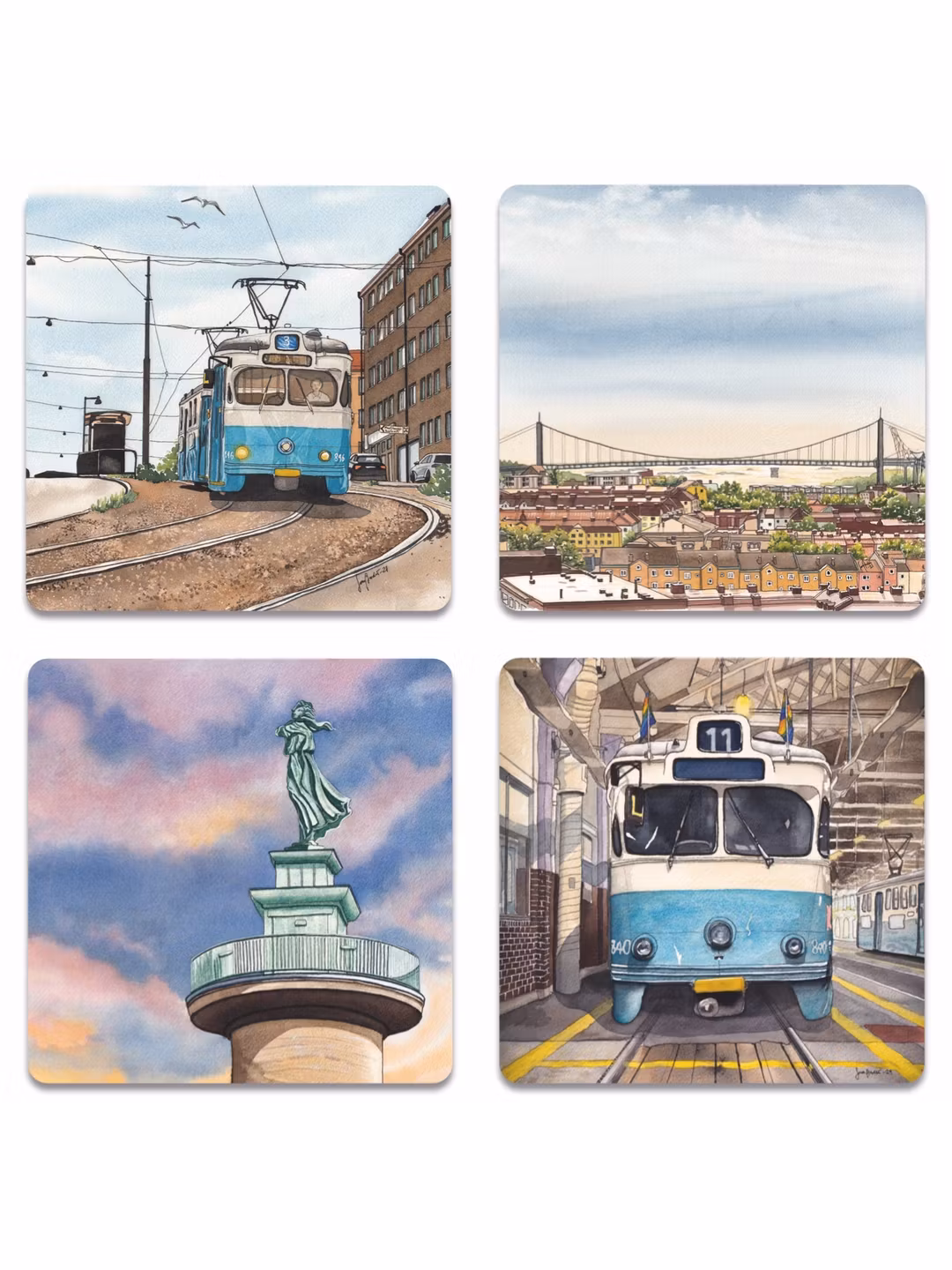 I lager. Glasunderlägg 4-pack Majorna 299 kr Lägg i korgen Hållbara glasunderlägg av björkfanér. Paketet innehåller fyra st underlägg med motiven Stigbergsliden, Älvsborgsbron, Kvinna vid havet och Vila i Vagnhallen. Tillverkas för hand på Öland. Fraktkostnad: 49 kr