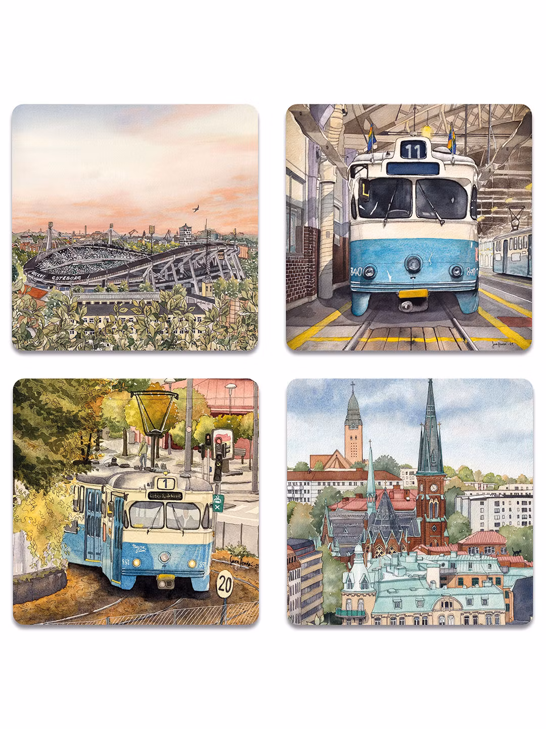 I lager. Glasunderlägg 4-pack Mixade stadsdelar 299 kr Lägg i korgen Hållbara glasunderlägg av björkfanér. Paketet innehåller fyra st underlägg med motiven Ullevi, Vila i vagnhallen, Redbergsplatsen och Linné. Tillverkas för hand på Öland. Fraktkostnad: 49 kr