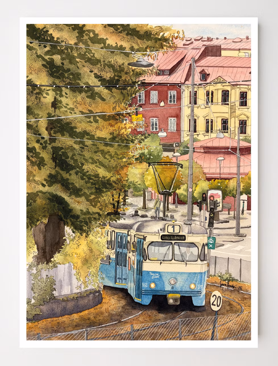 Tryck av akvarellmålning föreställande ettans spårvagn på väg uppför Härlandavägen med Redbergsplatsen bakom sig.