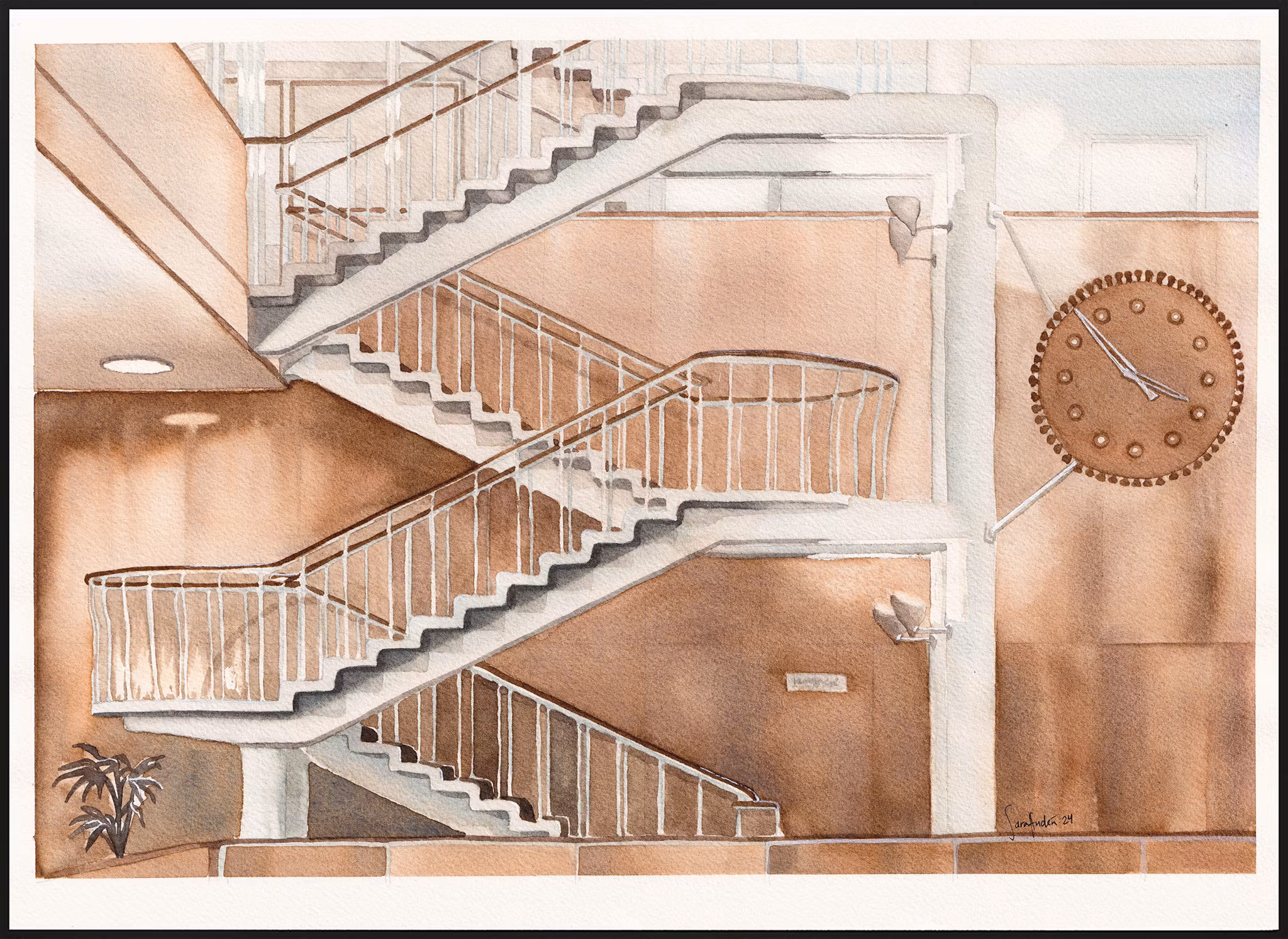 Konsttryck av akvarellmålning föreställande en del av interiören i Göteborgs stadshus och före detta Rådhus på Gustav Adolfs Torg.