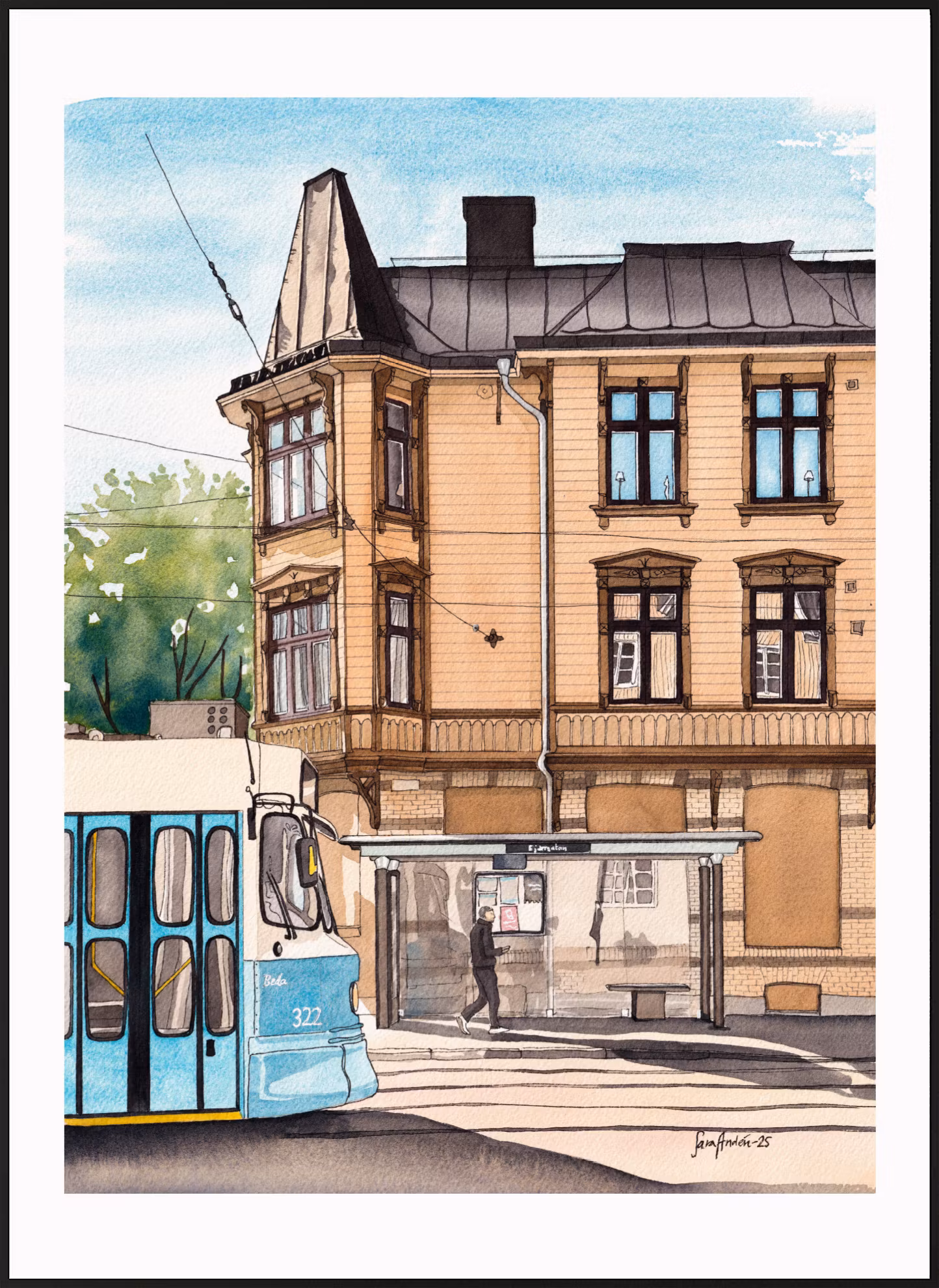 Konsttryck av akvarellmålning föreställande landshövdingehus vid hållplats Ejdergatan på Ånäsvägen i Bagaregården, Göteborg.
