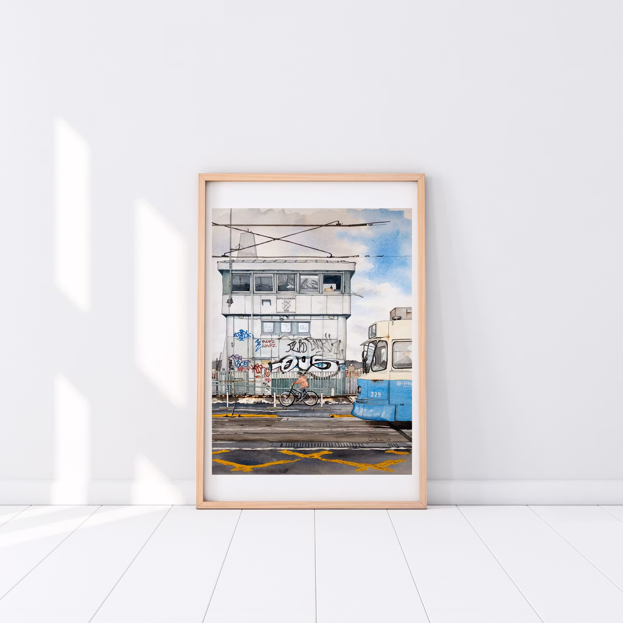 Konsttryck av akvarellmålning föreställande spårvagn och cyklist mitt på Götaälvbron. Bron finns inte kvar och rivningen påbörjades 2021 och avslutades 2022. Den nya Hisingsbron stod färdig 2021.