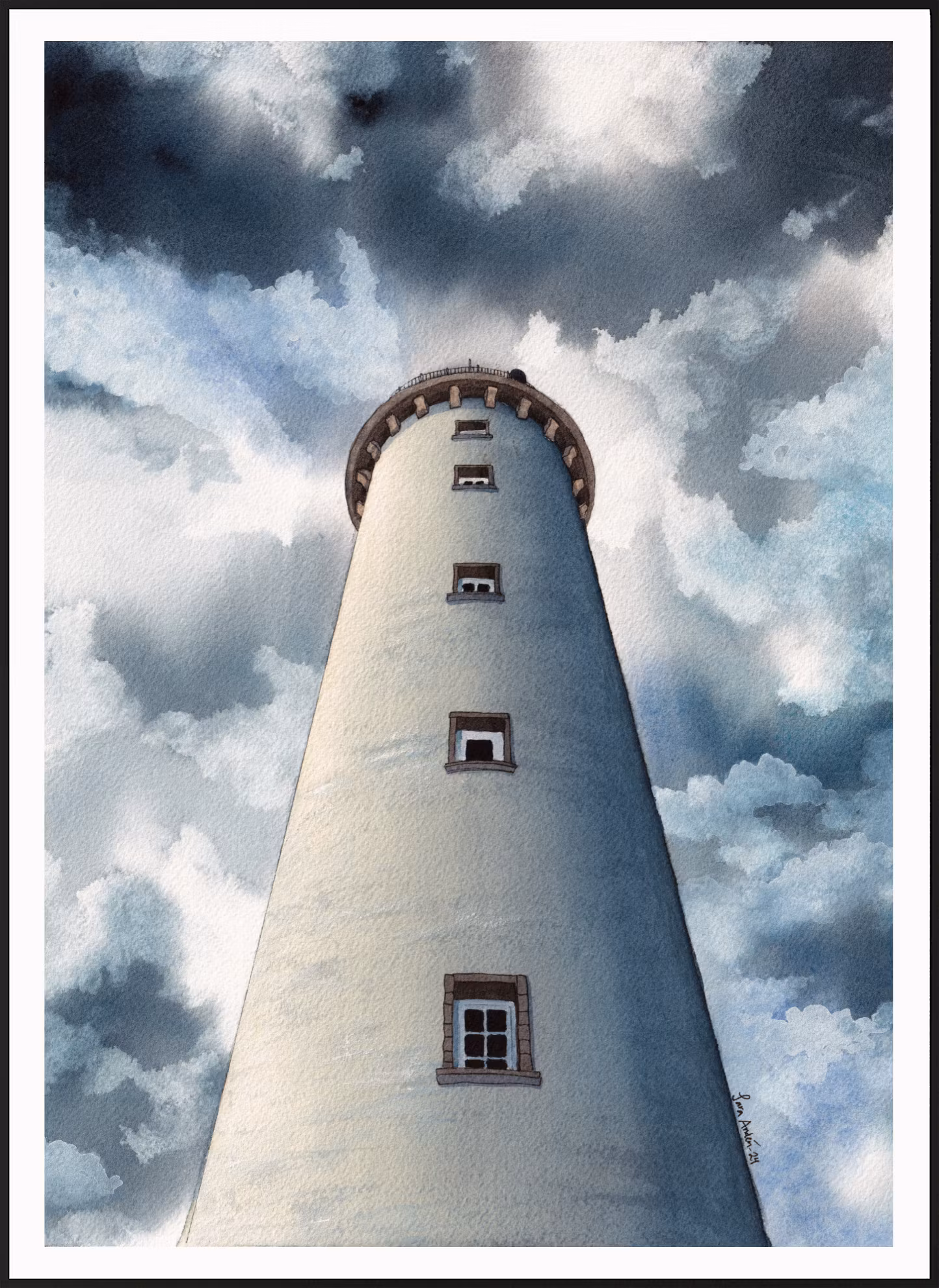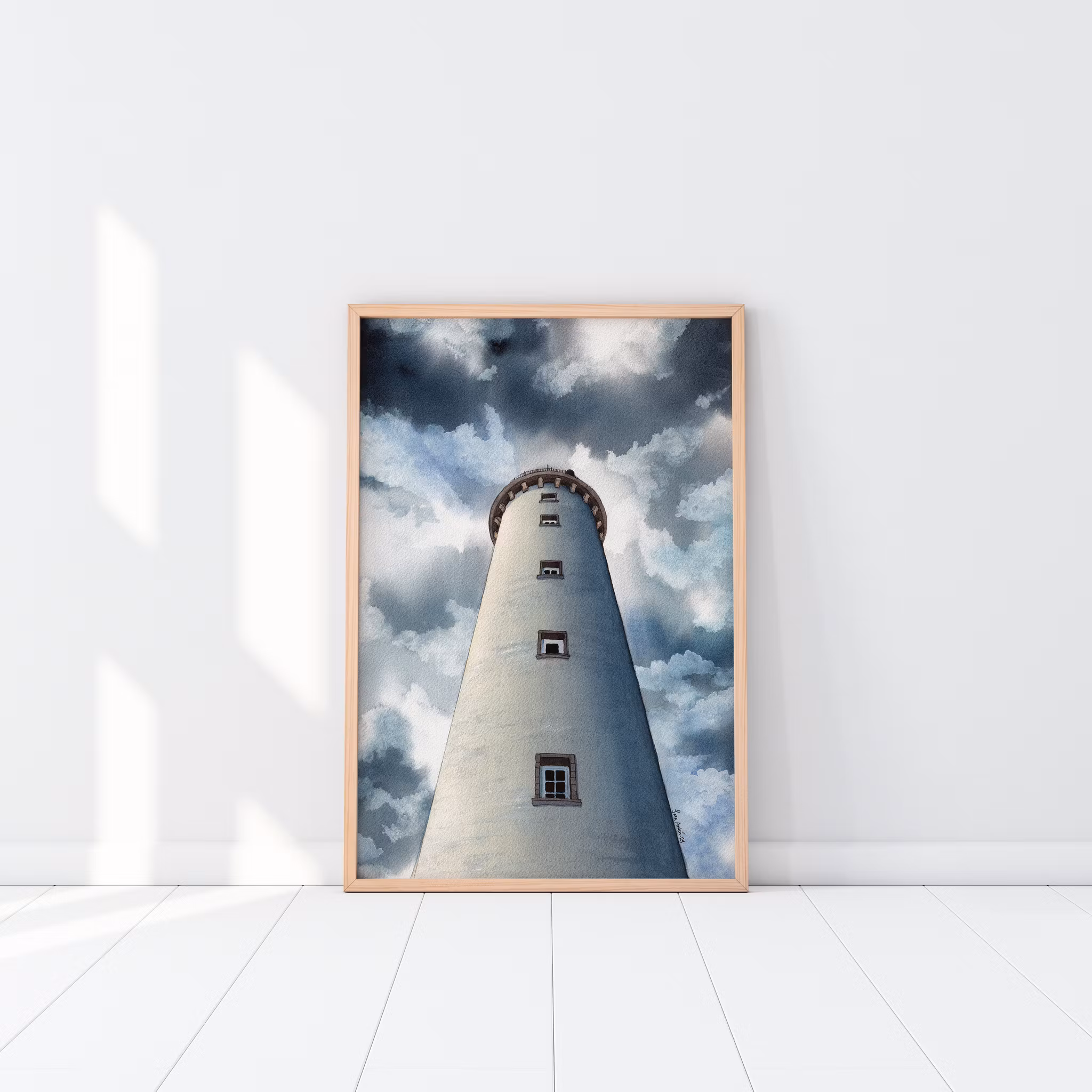 Print av akvarellmålning föreställande fyren och landmärket Långe Erik på Ölands norra udde.